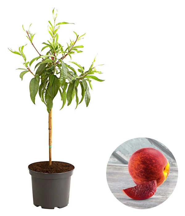 Holen Sie sich diese Neuheit in Ihren Garten: Eine rotfleischige Nektarine. Die Früchte werden Sie sofort begeistern, denn sie sind dunkelrot mit weißen Äderchen. Egal ob Sie die Früchte frisch vom Baum essen, verarbeiten oder als Garnitur für Süßsepisen verwenden, die Blutnektarinen machen immer eine gute Figur. Und das Beste ist: Sie sehen nicht nur gut aus, sondern schmecken auch richtig gut. Es handelt sich um sehr saftige und aromatische Nektarinen. Der Geschmack ist die perfekte Mischung aus süß und sauer. Ein weiterer Vorteil ist die die Robustheit des Baumes, er ist vor allem sehr wenig anfällig für die Kräuselkrankheit. Überzeugen Sie sich selbst von den leckeren Früchten! Der Baum hat auch einen hohen Zierwert und wird Ihren Garten bereichern. Im Frühjahr schmückt er sich mit wunderschönen rosafarbenen Blüten, im Sommer mit den blutroten Früchten und im Herbst mit einer knalligen Herbstfärbung der Blätter.