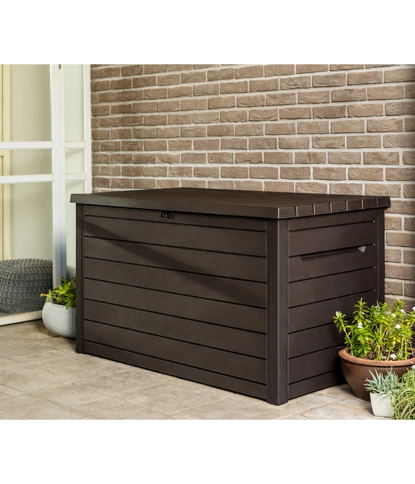 Wenn die ganze Familie im Garten aktiv ist, dann kommen unterschiedliche Spielsachen, Geräte, Utensilien und vieles mehr zum Einsatz. Dank der Keter Auflagenbox Ontario haben Sie immer einen optimalen Ort zur Verfügung, an dem sich alles ganz leicht verstauen lässt. Tragen Sie somit zur Sicherheit, Ordnung und Übersicht in Ihrem Außenbereich bei und profitieren Sie zugleich davon, alle wichtigen Dinge griffbereit zu haben. Natürlich profitieren Sie ebenso von einem modernen, dunklen Design und sorgen so für einen zeitgemäßen und geschmackvollen Akzent an vielen Orten.