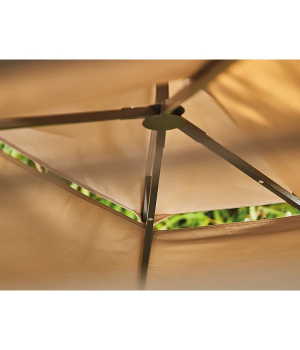 Das Besondere am Siena Garden Pavillon BBQ ist das zweigeteilte Dach. Da das zusätzliche, kleinere Lüftungsdach erhöht ist, kann der Rauch des Grills sowie die dort entstehende Hitze ungehindert abziehen und am Grill herrscht ein angenehmes Klima. Da das kleine Dach aber zugleich überlappend ist, kann von oben auch nichts durch das Dach dringen, sodass Sie auch bei einsetzendem Regen Ihre Grillparty nicht abbrechen müssen. Die Dachplane besteht aus einer hochwertigen, strapazierfähigen Polyesterqualität (180 g/m²) und hat eine zusätzliche Polyamid-Beschichtung. Das Dach in der Farbe Taupe sieht nicht nur edel aus, die Farbe hat auch den praktischen Nebennutzen, dass sie grelles Sonnenlicht dämpft, aber trotzdem ausreichend Helligkeit in den Innenraum lässt.
