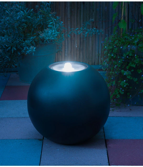 Wählen Sie den Aufstellort für Ihren Ubbink Leichtbeton-Gartenbrunnen Pizarra so, dass Sie ihn von Ihren Lieblingsplätzen aus immer gut sehen können, um seine Ausstrahlung in den schönstens Momenten genießen zu können. Das gilt auch bei Nacht. Denn die kleine Sprudelquelle setzt sich bei Dunkelheit mittels der LED-Beleuchtung stimmungsvoll in Szene. Ein toller Anblick, weil das Licht auch den oberen Teil der Kugel in sanften Lichtschein hüllt.